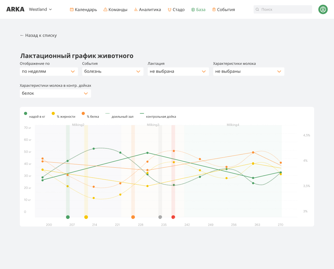 Получайте графики надоев со всеми данными по доению. Используйте нашу аналитику для роста эффективности удоя